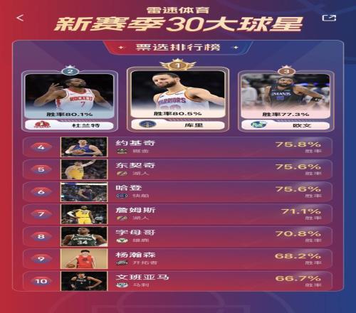 雷速体育10月15报道 雷速NBA新赛季30大球星活动的第一阶段即将进入最终的尾声