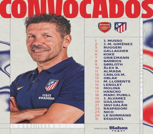 马竞公布欧冠战阿森纳大名单:小蜘蛛、格列兹曼领衔