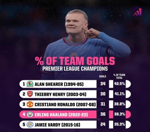 英超冠军头号射手进球比例榜:希勒亨利C罗前三,哈兰德38.3%第四