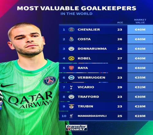 在完成最新一次身价更新后,德国转会市场网站列出了世界足坛门将身价榜,大巴黎门将舍瓦利耶以4000万欧位列第一。