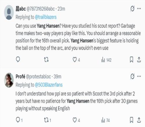 美国球迷:斯普利特看过杨瀚森的球员报告吗?垃圾时间都这样使用杨瀚森?你应该为一个首轮16顺位的新秀安排一个合理的问题,他最大的特点是三分弧顶持球指挥战术,而你根本不懂用他;