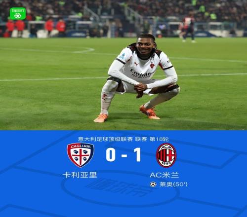 北京时间1月3日,意大利足球顶级联赛第18轮,卡利亚里主场迎战AC米兰。比赛中,上半场阿波多、马齐泰利打门造险,下半场莱奥破门+中柱,普利希奇、莫德里奇打门被扑。凭借此次进球,AC米兰客场1比0战胜卡利亚里。