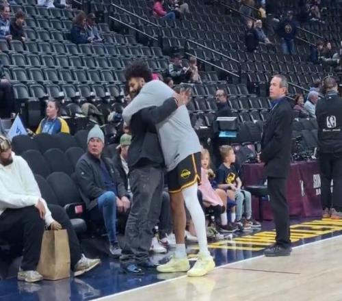 在掘金主场111-121雷霆的比赛前,贾马尔-穆雷的父亲在场边拥抱儿子,庆祝他首次入选NBA全明星。
